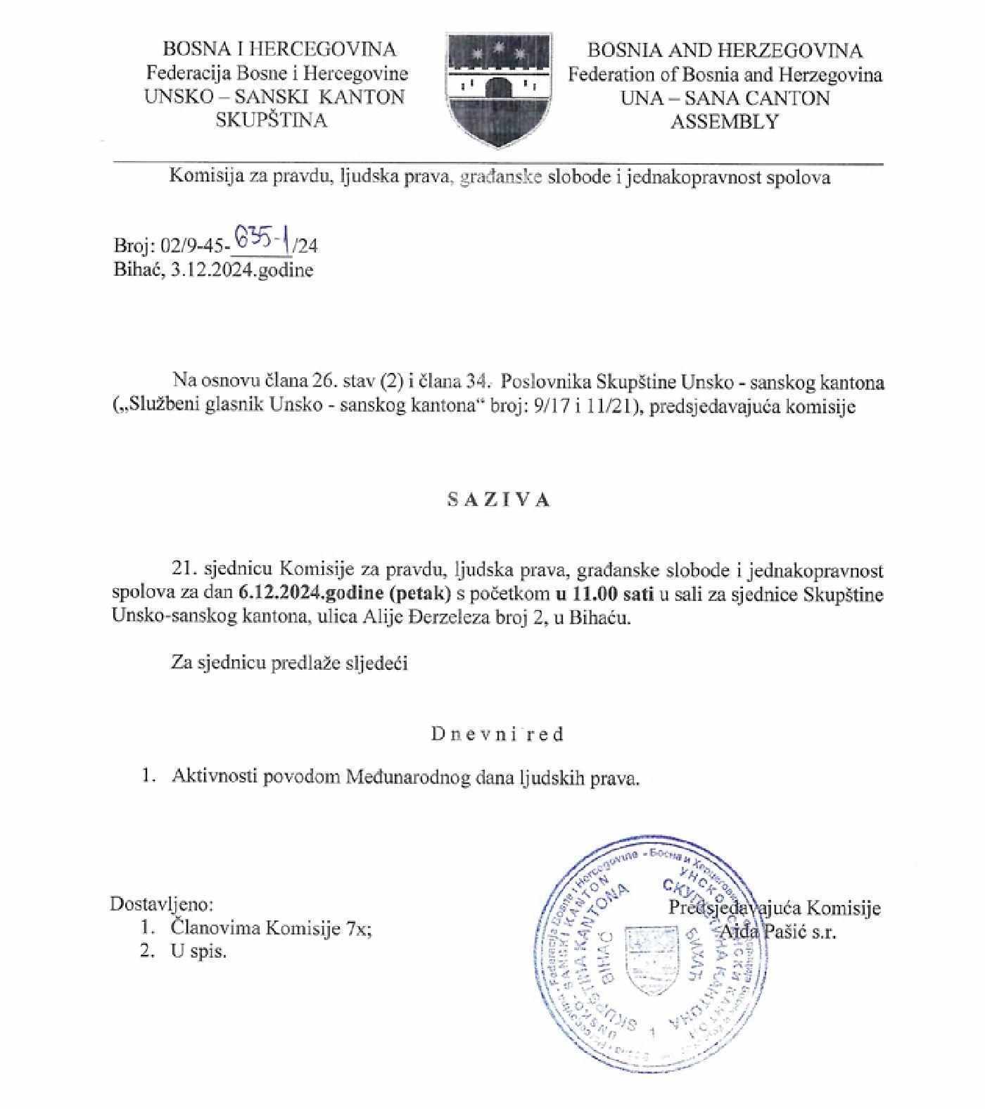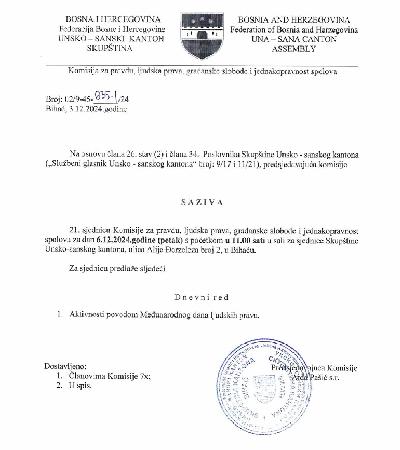 Predsjedavajuća Komisije za pravdu, ljudska prava, građanske slobode i jednakopravnost spolova Aida Pašić, sazvala je 21. sjednicu ovog zakonodavnog tijela zakazanu za petak, 06. decembra ove godine s početkom u 11.00 sati.